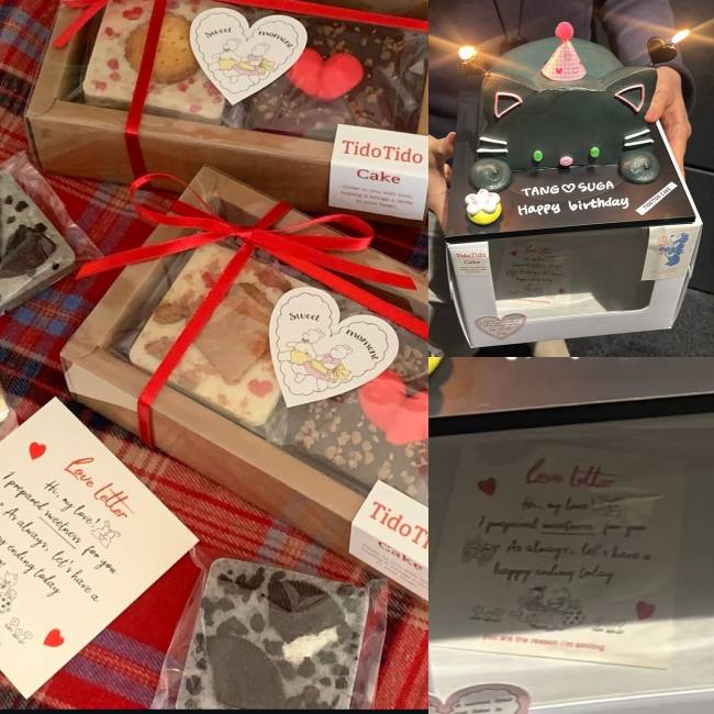 On the other hand, some fans pointed out that the card with the noticeable phrase “my love” seen in SUGA’s birthday cake photo was actually not a message written specifically for him. According to them, it is a signature card that is commonly included with birthday cakes from the bakery brand Tido Tido. In other words, it is pre-printed content from the shop rather than a personal letter.