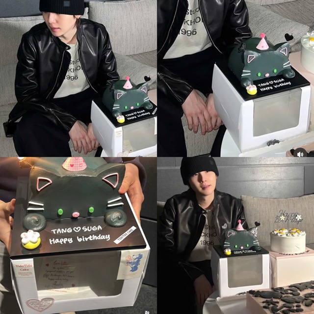 He also received more birthday cakes than usual and later chose two of the cakes gifted by friends, staff, and family members to bring along to his live broadcast with fans. One cake was wнιтe and decorated in a daisy theme with a striking yellow center, while the other was a black cat-shaped cake featuring the words “Tang & SUGA” — a reference to the three-year-old pet cat the rapper is raising.