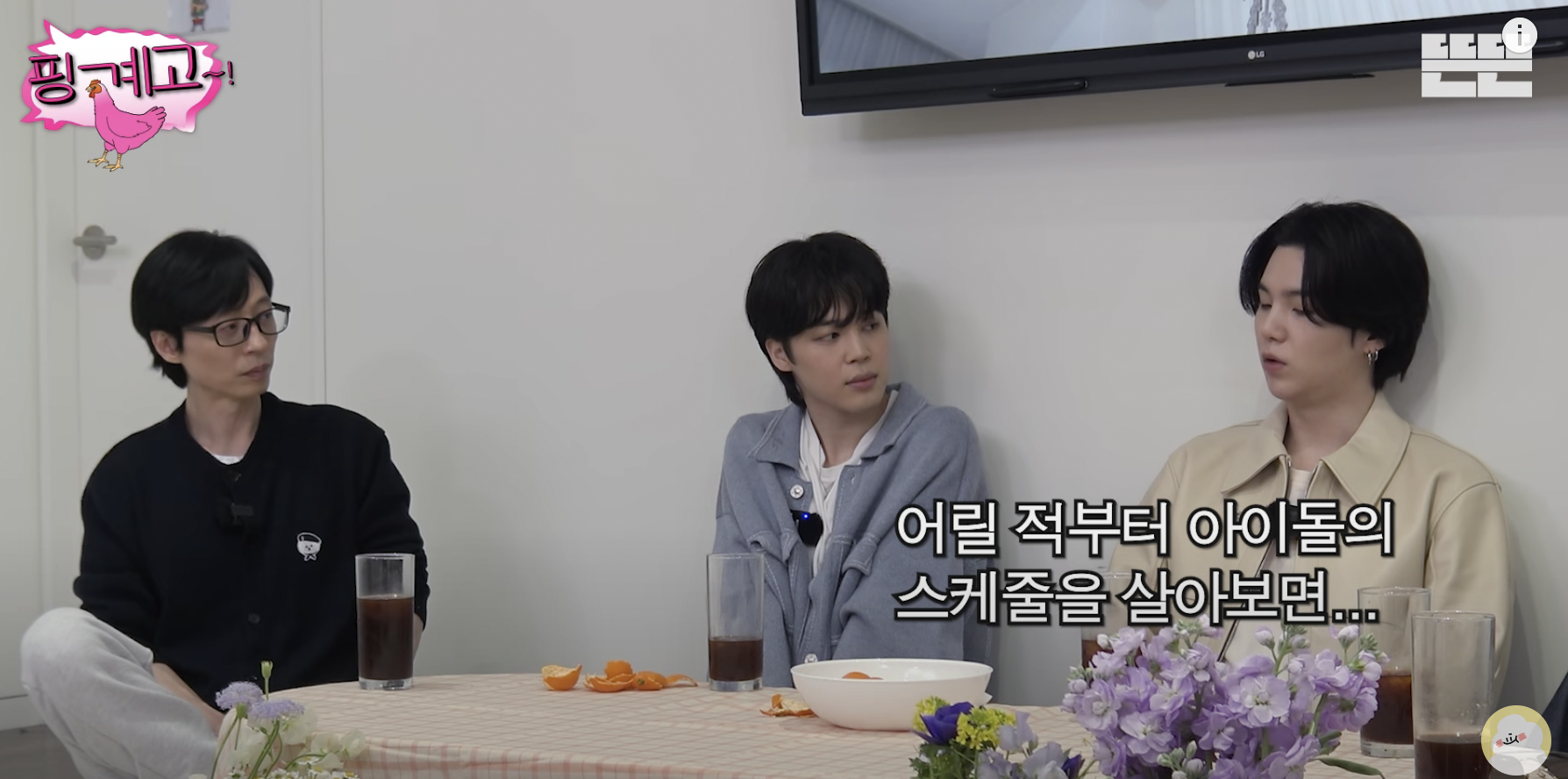 On the afternoon of the 11th, the latest episode of Just An Excuse of the YouTube channel 'Tteuntteun' featuring Jimin and SUGA was broadcast. The show is hosted by national MC Yoo Jae Suk and other guests such as Ji Seok-jin and Jo Se-ho.