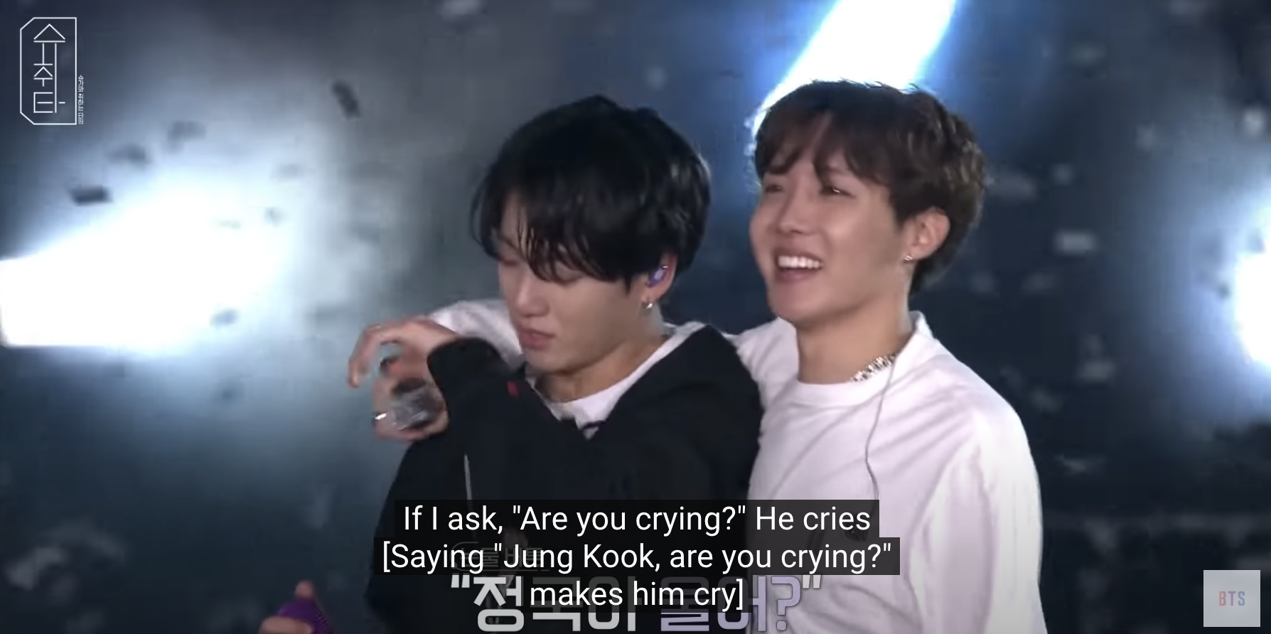 On the other hand, SUGA’s half-joking remark, "If I ask, ‘Are you crying?’, he cries" reveals the deep bond between the members. It shows the trust and comfort in their brotherhood, where Jungkook can freely show his softer side without fear of judgment. On a deeper level, it also reflects the balance between their superstar image and their identity as just boys in a close-knit family.