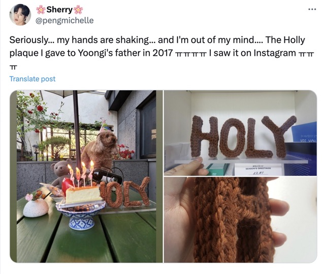 But what's even more remarkable is that a fan posted a post saying that she was the one who crocheted the dog's initials and gave them to SUGA's dad in 2017.