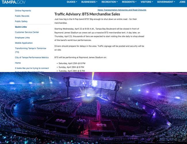 Notably, on the 22nd, local fans and media began circulating information that the Tampa government had decided to close Tampa Bay Boulevard solely to set up sales tents for BTS’s concert merchandise. The concerts will be held at Raymond James Stadium on April 25, 26, and 28, meaning road closures will be in effect from 6 AM on April 22 to 6 PM on April 29. This decisive move by the Tampa authorities highlights just how significant BTS’s concerts are considered and has generated great excitement among local fans.