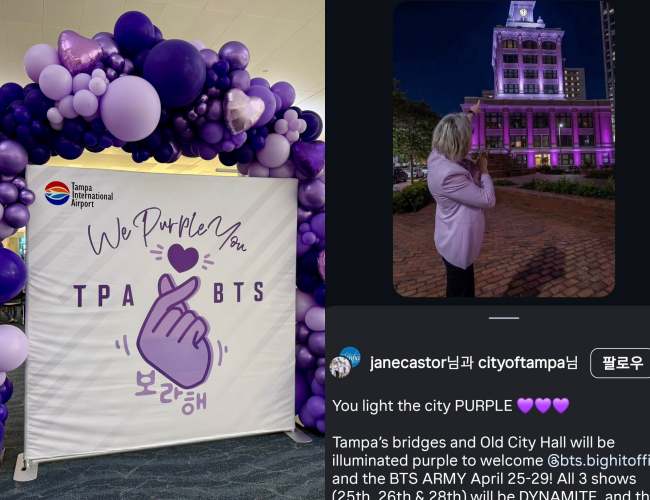 Although there are still a few days left before the first show, fans—and even local authorities—have already been busy preparing to welcome the K-pop superstars to the city. Tampa International Airport has been decorated in BTS’s signature purple, featuring iconic slogans such as “We Purple You.” The Tampa Riverwalk and Old City Hall have also been illuminated in purple. The mayor of Tampa even stated confidently on Instagram that the city aims to show the world there is no better place than Tampa for the first stop of the North αмєяι¢αn leg.