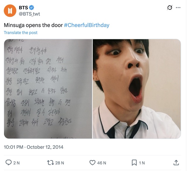 Not only that, but many past stories between Jimin and BTS members have also been recalled as part of the event. They include a handwritten letter that SUGA sent to Jimin on his birthday 11 years ago — which was also one year after BTS’s debut.