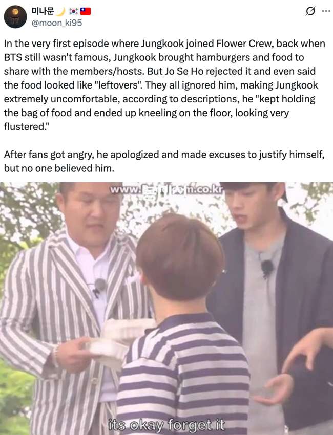 SUGA’s story was not the only instance in which BTS were marginalized during their rookie years. Fans have not forgotten the incident in which the youngest member, Jungkook, was disrespected by comedian Jo Se-ho on the program Flower Crew. At the time, Jungkook enthusiastically bought the best burgers to treat the cast, only for Jo Se-ho to bluntly refuse them, saying they looked like “leftovers,” leaving the young idol standing there in silence.