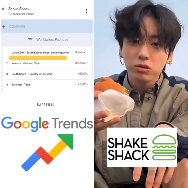 Social media became flooded with Shake Shack posts related to Jungkook’s livestream. According to Google Trends, #JUNGKOOK has been the #1 breakout topic under “Shake Shack” worldwide over the past day after he was seen eating their food. Clearly, ordering this burger has become a new trend among fans.