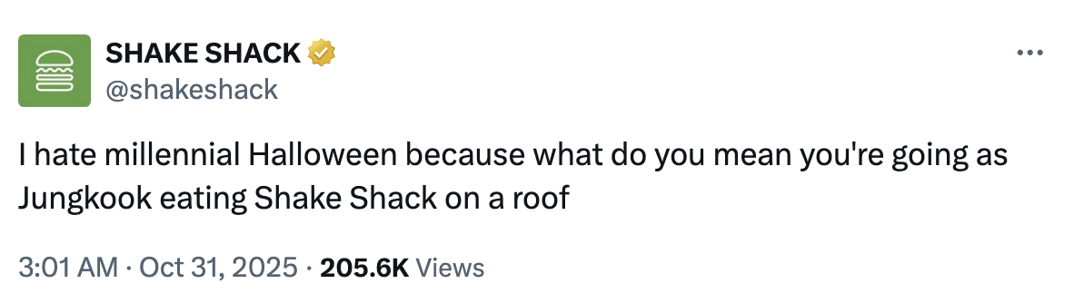However, it seems Shake Shack wasn’t exactly “pleased” with this rising craze. On the 31st, the brand posted a tweet on its official account saying: “I hate millennial Halloween because what do you mean you're going as Jungkook eating Shake Shack on a roof,” playfully teasing fans who “copied” the K-pop superstar’s meal.