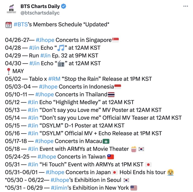 Specifically, a BTS fan account has listed the busy schedules of BTS members from late April to early August. While members like Jin and j-hope are touring in many countries around the world, RM released a new song in collaboration with Tablo.