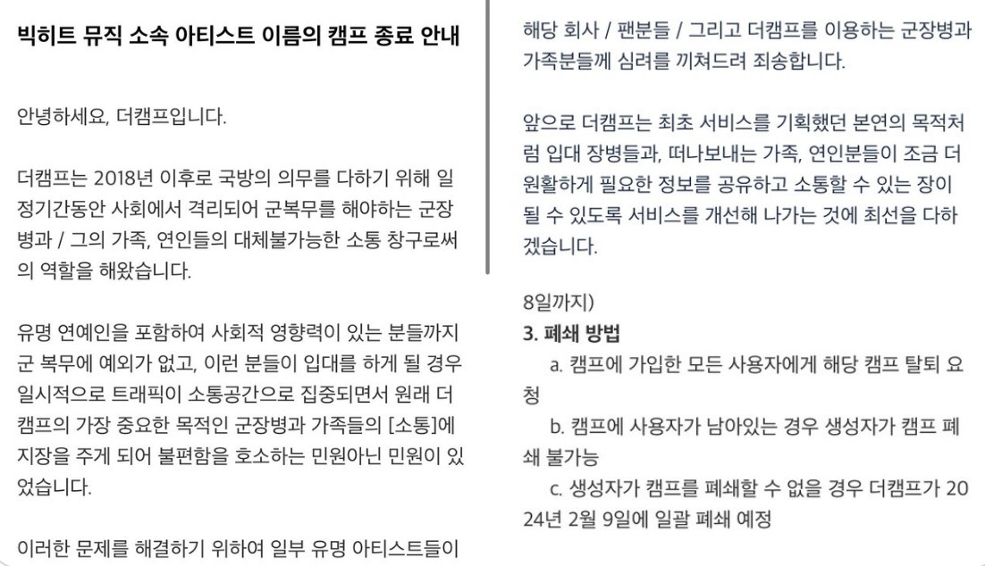 Next, they added: "As the request of Big Hit Music, The Camp will restrict the operations of all camps established under the names of Big Hit artists. Accordingly, camps under the names of Big Hit artists would close too so those users can't send messages. Please note that even if a Big Hit artist's name is used without permission even after the camp has ended, the camp may forced to close or the person involved may be held legally responsible."