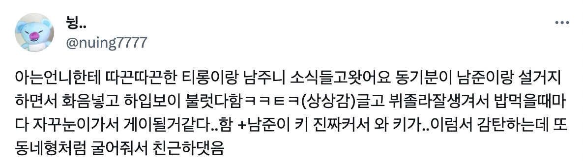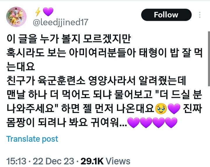 On the contrary, the place where RM and V are stationed seems to have the most news about them. A nutritionist at the Nonsan training center shared that V often eats very well. OP recounts the words of a friend who is a nutritionist: "It's said Taehyung-ie is eating well. My friend is a nutritionist at the army training center, so I was told that Taehyung always asks if he can eat one more, and if he was asked, "Anyone who wants more, please come out", he comes out first. I think Taehyung will become really buff. Cute..."