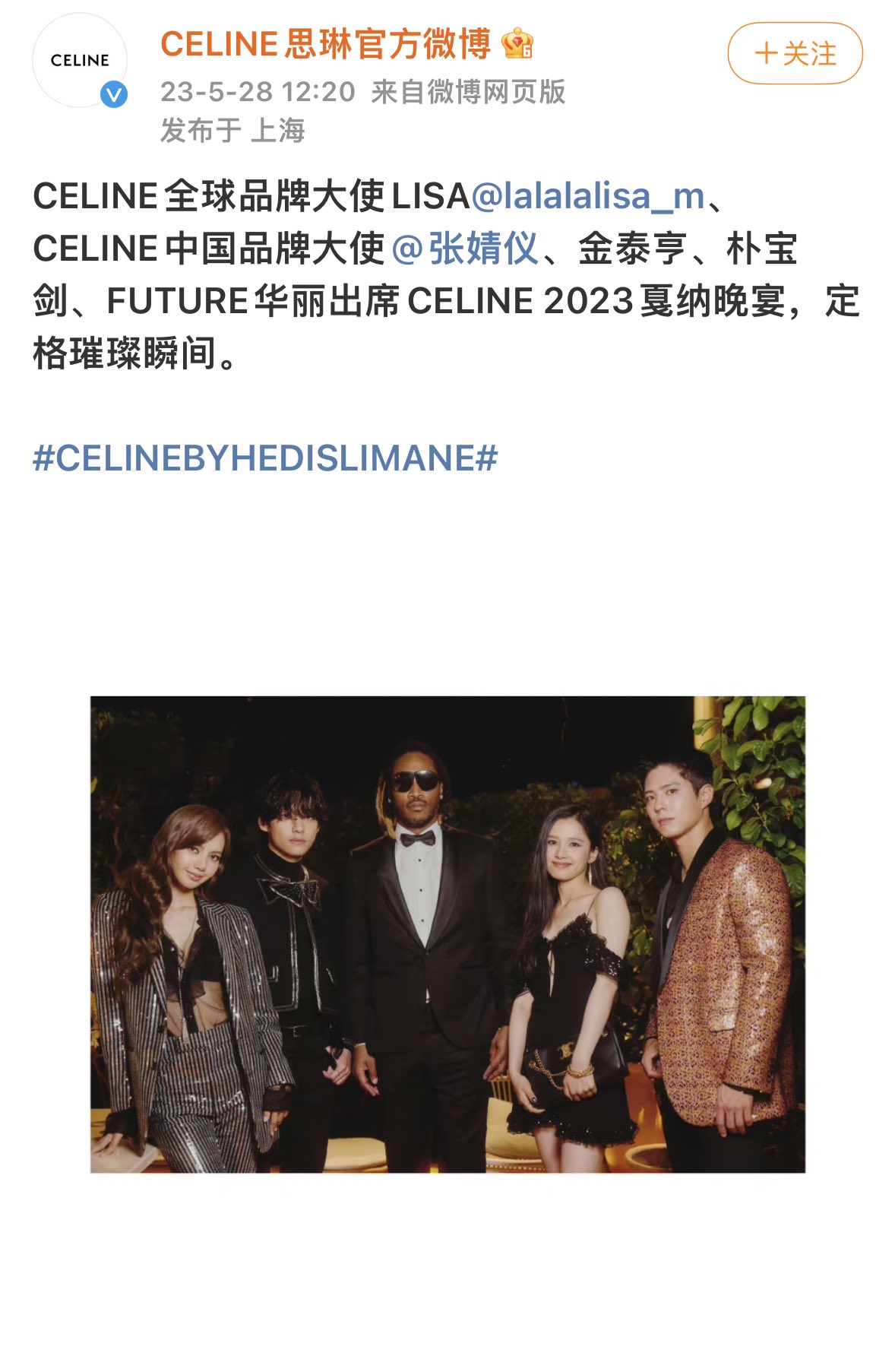 Specifically, they wrote: "CELINE Global Brand Ambäṩṩador #LISA, CELINE’s ċḧïńä BA @.张靖仪, & Kim Taehyung, Park Bogum, and FUTURE attended the CELINE 2023 Cannes Dinner, freezing the bright moments.”