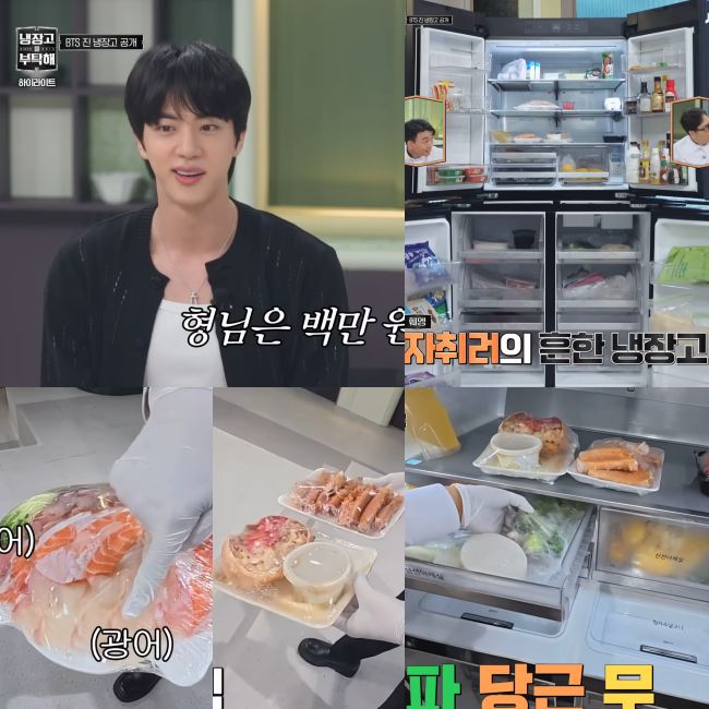 In particular, Jin’s fridge is said to exemplify what a true superstar’s refrigerator looks like. He keeps fresh αѕѕorted sashimi (flounder, salmon, tuna) and, notably, a pre-prepared king crab set. Jin candidly admitted that he liked king crab as a child but couldn’t afford it, and now that he has succeeded, he eats it about once every two weeks. Later, as prices rose, he shifted to every three weeks, which made the show’s members laugh.