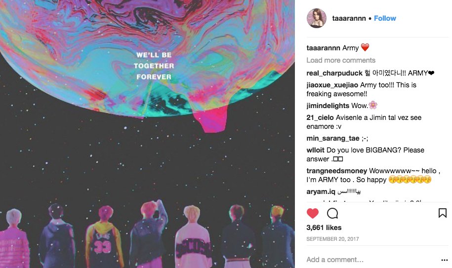 Shortly afterward, ARMYs quickly uncovered some proofs of her loyalty to BTS on social media. One of Taran’s old posts featuring all seven members of BTS resurfaced and rapidly went viral again.