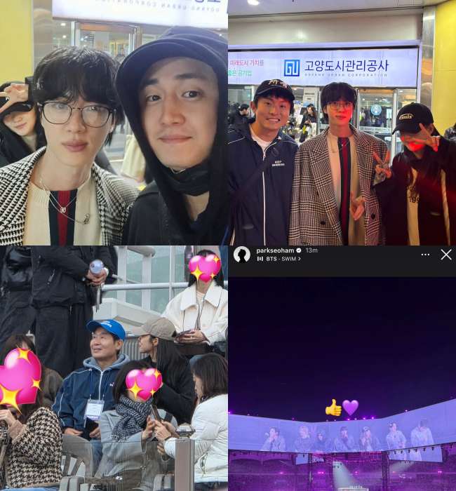 V’s well-known friend group, the Wooga Squad, was present in full force, including Park Seo-joon, Park Hyung-sik, Peakboy, and Choi Woo-shik. The group was spotted wearing blue “Swim” jackets, standing in the stands, waving ARMY Bombs, and energetically enjoying each performance. Actress Ha Ji-won, a longtime friend of V, also made a surprise appearance and was even seen taking a backstage photo with V and Jungkook.
