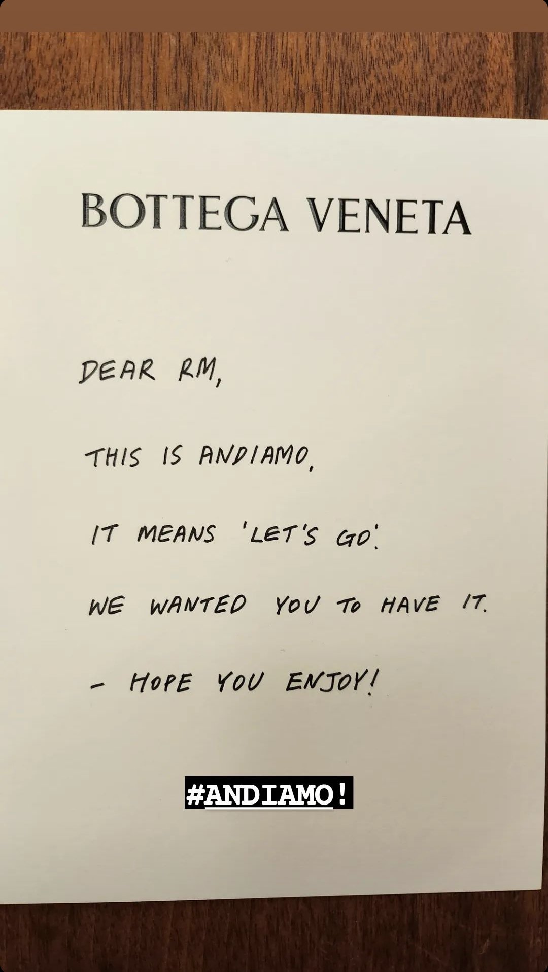 It's worth noting that the famously low-key, “stealth-wealth” house Bottega Veneta is very picky in choosing its ambαssadors and they rarely use ḳöŕệän celebs for their campaigns. However, today, RM posted on his personal page a letter sent from this high-end Italian fashion house. RM seems to have received the brand's newly launched bag.