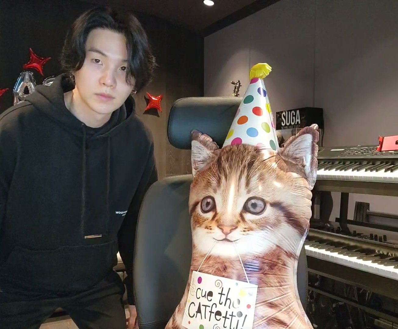 Before his birthday officially caught, SUGA turned Weverse Live and sat down with the ARMYS. Like the other members, SUGA celebrated his birthday with ARMYS at his studio. But today, SUGA's studio is decorated with lots of balloons and even a cat -shaped ball -shaped ball. It makes many ARMYS interested and curious.
