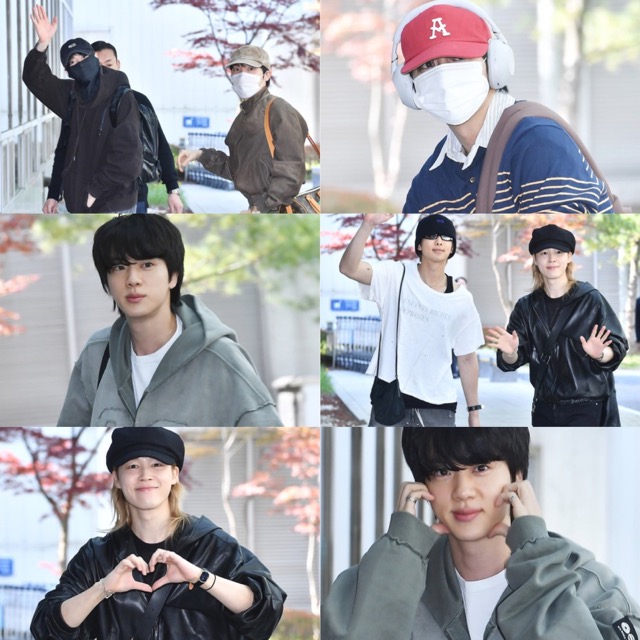 At 3 PM on April 15, six BTS members—excluding SUGA—were spotted at the Seoul Gimpo Business Aviation Center (SGBAC) in Banghwa-dong to complete departure procedures for their flight to נαραи. The members looked effortlessly stylish in comfortable yet fashionable outfits. As usual, V and Jungkook covered most of their faces with hats and masks. What stood out the most, however, was their cheerful and friendly demeanor. All of them enthusiastically waved and greeted reporters and fans who had crowded the airport before heading inside.