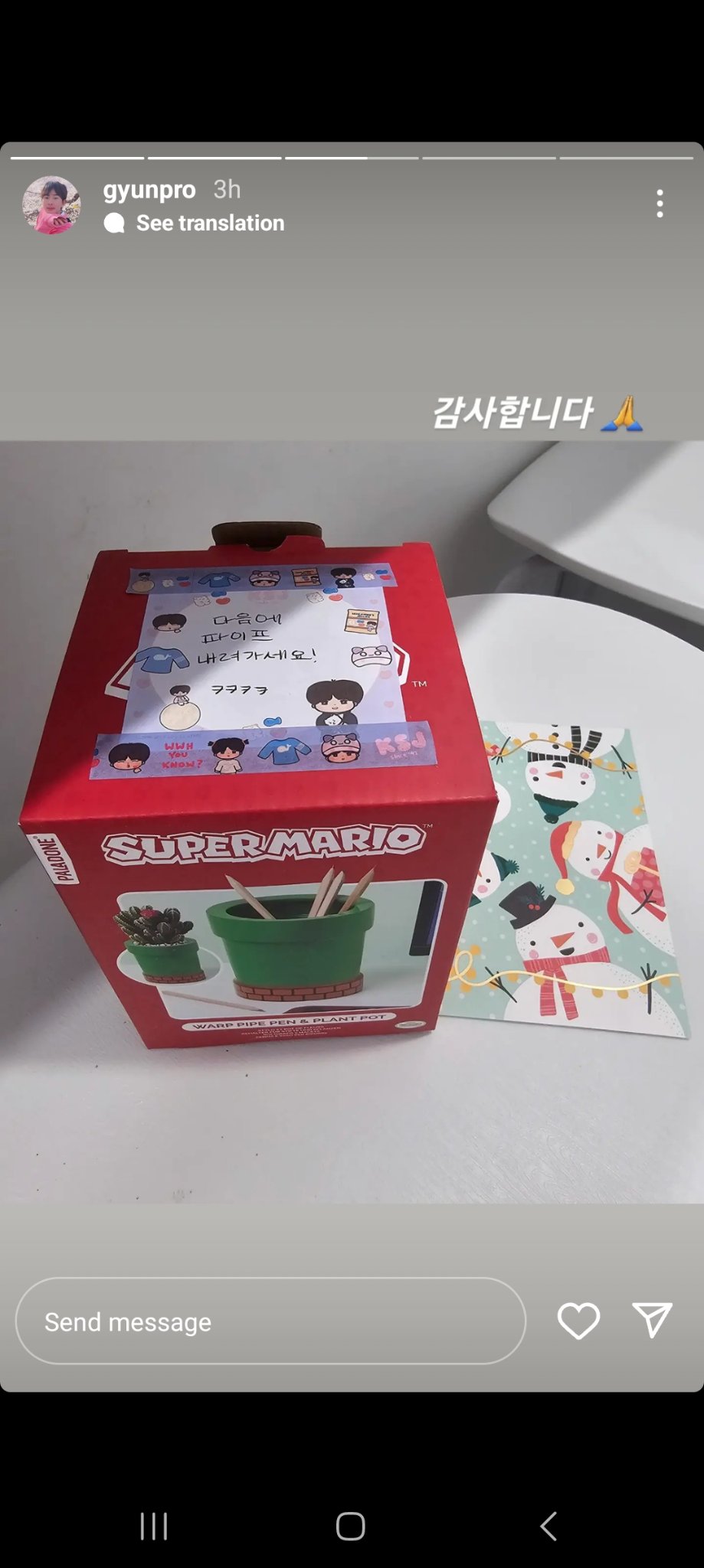 In the photo, a gift fans initially thought was from Jin to his coach. This fan account noted the message Jin wrote on the gift: "Seokjin gave to bts run tennis coach a Christmas gift and the way he wrote in the message: Jin: "Next time go down the tube (about the Super Mario bros gift) kekeke WWH you KNOW?"/ The coach: Thank you". Since then, the post has gone viral with more than 700,000 híts and many fans expressing admiration for Jin's cuteness.