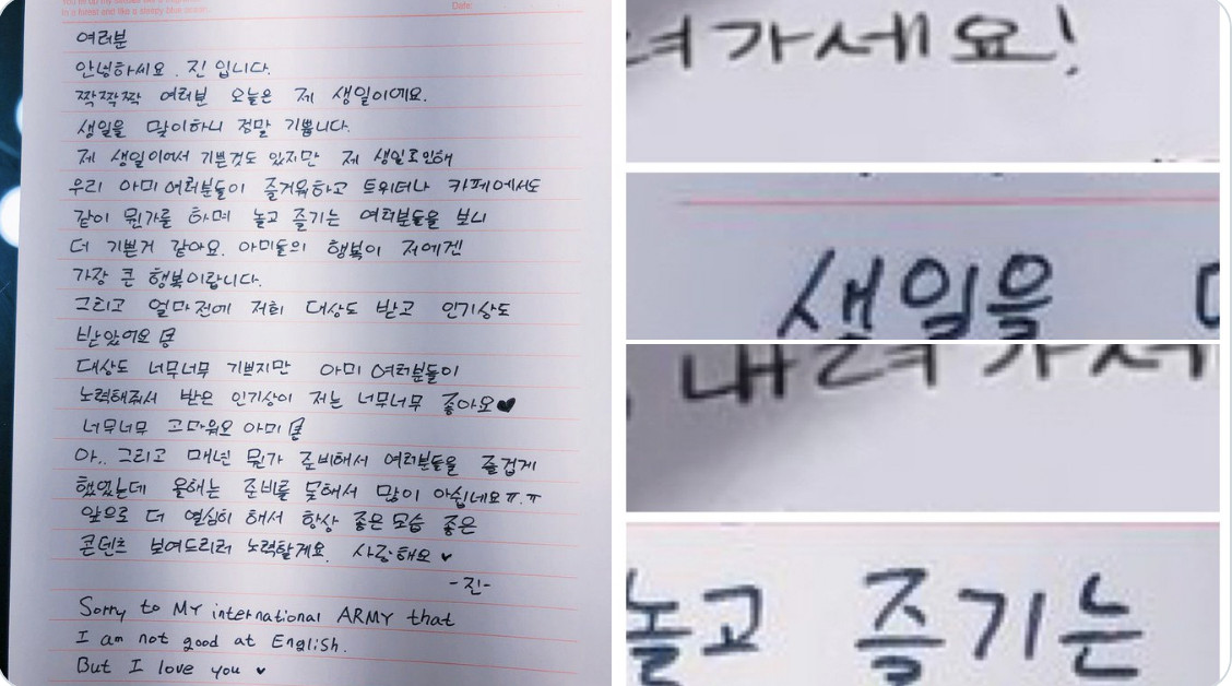 But not long after, some fans also discovered soṃệẗḧing suspicious about the letter Jin supposedly wrote. They compared the handwriting on the gift and previous letters he had written and saw the difference. Specifically, Jin's ㅅ ㄹ and ㄴ looks consistent in his letter and doesn't match this note. Moreover, Jin's use of tapes made by fans is quite puzzling.