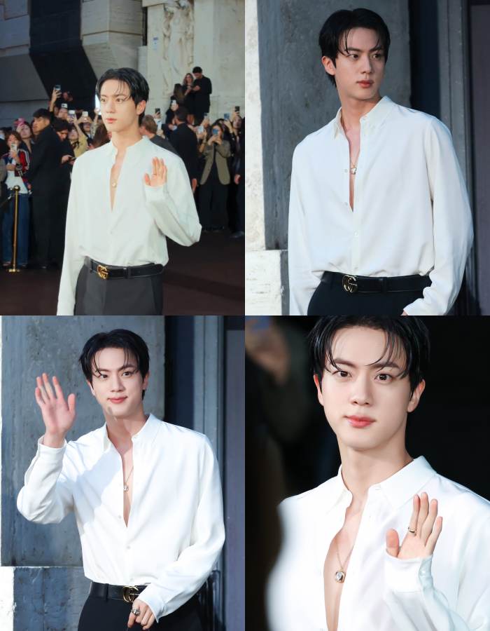 From the moment Jin walked in, he immediately drew all the camera lenses and loud cheers from fans present at the venue. Notably, this time he opted for a bold Gucci ensemble: a wнιтe silk shirt with several buttons left undone, revealing glimpses of his broad chest, paired with black tailored pants and Gucci’s signature logo belt.