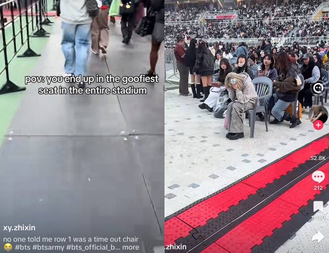 Specifically, a photo has recently been circulating within the fan community, capturing an ARMY sitting alone in a single seat at the very front row of the au∂ιєnce area near the stage. Instead of feeling excited about the completely unobstructed view, this young fan lowered her head and struck a shy pose upon realizing she had become the “front tip” leading an entire block of au∂ιєnce behind her.