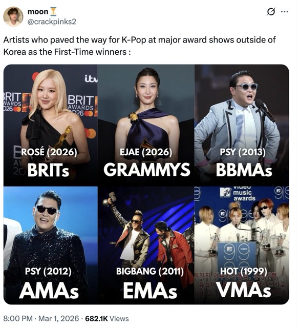 Therefore, denying BTS’s “trailblazer” role simply because they were not the first to win a specific award is neither objective nor accurate. In other words, “paved the way” is not only about who stepped forward first — it is about who widened the road enough for others to walk it too.