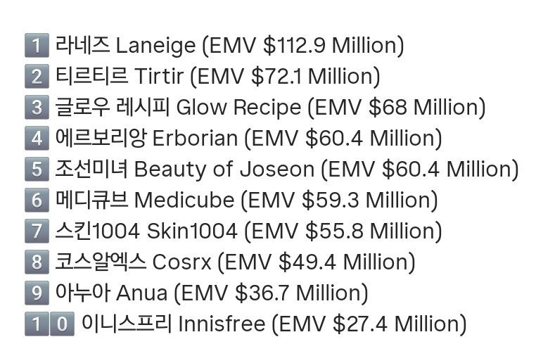 - Huge respect to Jin and V for boosting Laneige and Tirtir to the top of the EMV charts! Their star power continues to shape the industry