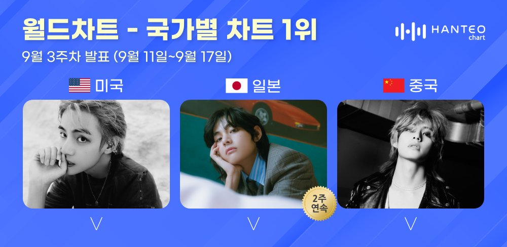 This week's country charts are compiled from the 11th to the 17th. In the data compilation, V took the top spot in all US, ̾j̾a̾p̾a̾n, and ¢нιиα country charts!