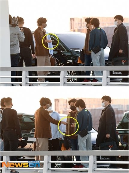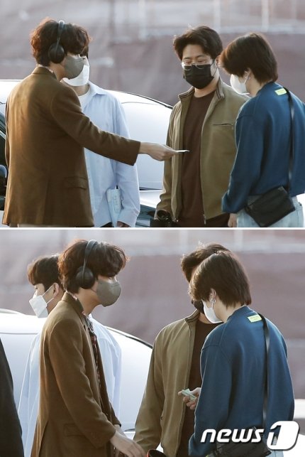 - K-media took a pic of Taehyung gave 10,000 won to Yoongi at today's airport. Even they wrote the title as "V, give Suga hyung "10k won" pocket money?"