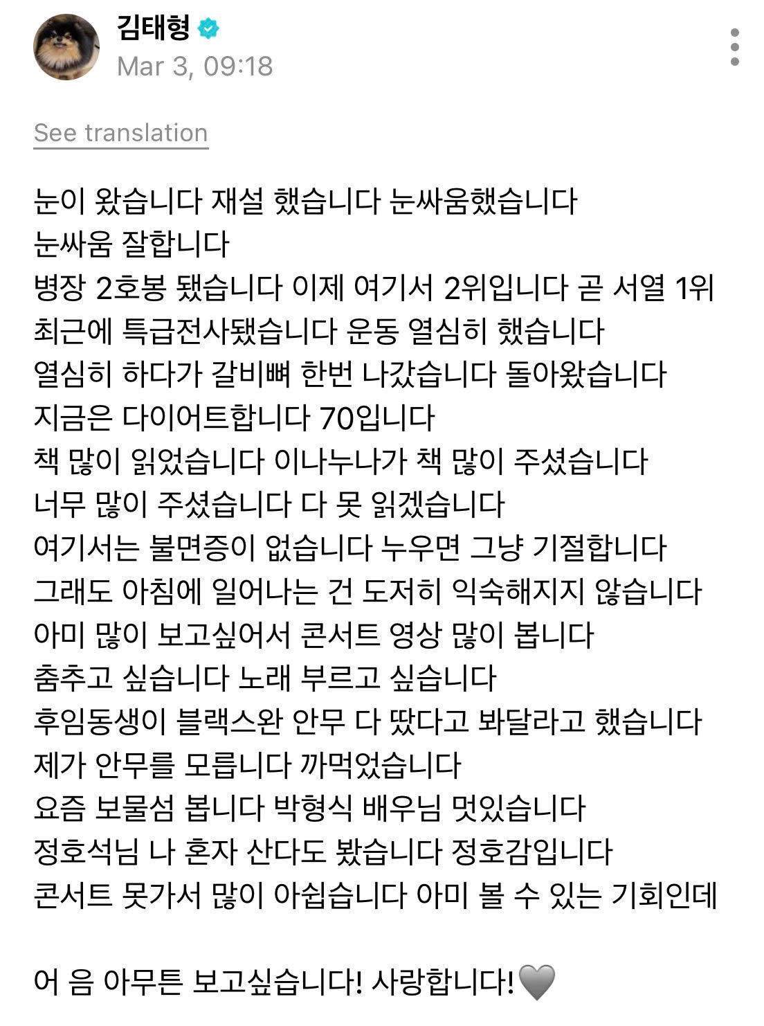 Fortunately, on March 3, the day after the Seoul concert series ended, V spoke up to clarify whether he was there or not with a post on Weverse. He captioned it: "I'm so sad that I can't attend the concert. It's an opportunity to see ARMYs", which is equivalent to confirming that he did not attend the concert.