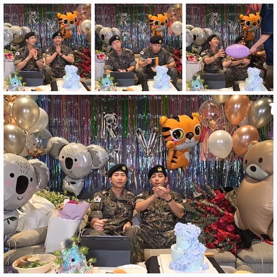 Just hours after leaving the military barracks, RM and V celebrated their discharge together in a Weverse live broadcast. The two members officially greeted ARMYs all over the world after 18 months in a room decorated with cute balloons, fresh flowers, and cakes.