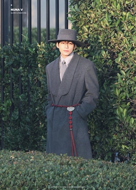 V was seen wearing a Hollywood-inspired outfit infused with traditional кσяєαn elements, including a Norigae-style belt from the hanbok, characteristic layered clothing, and a hat inspired by the gat—the headwear of the wealthy clαѕѕ during the Joseon era.