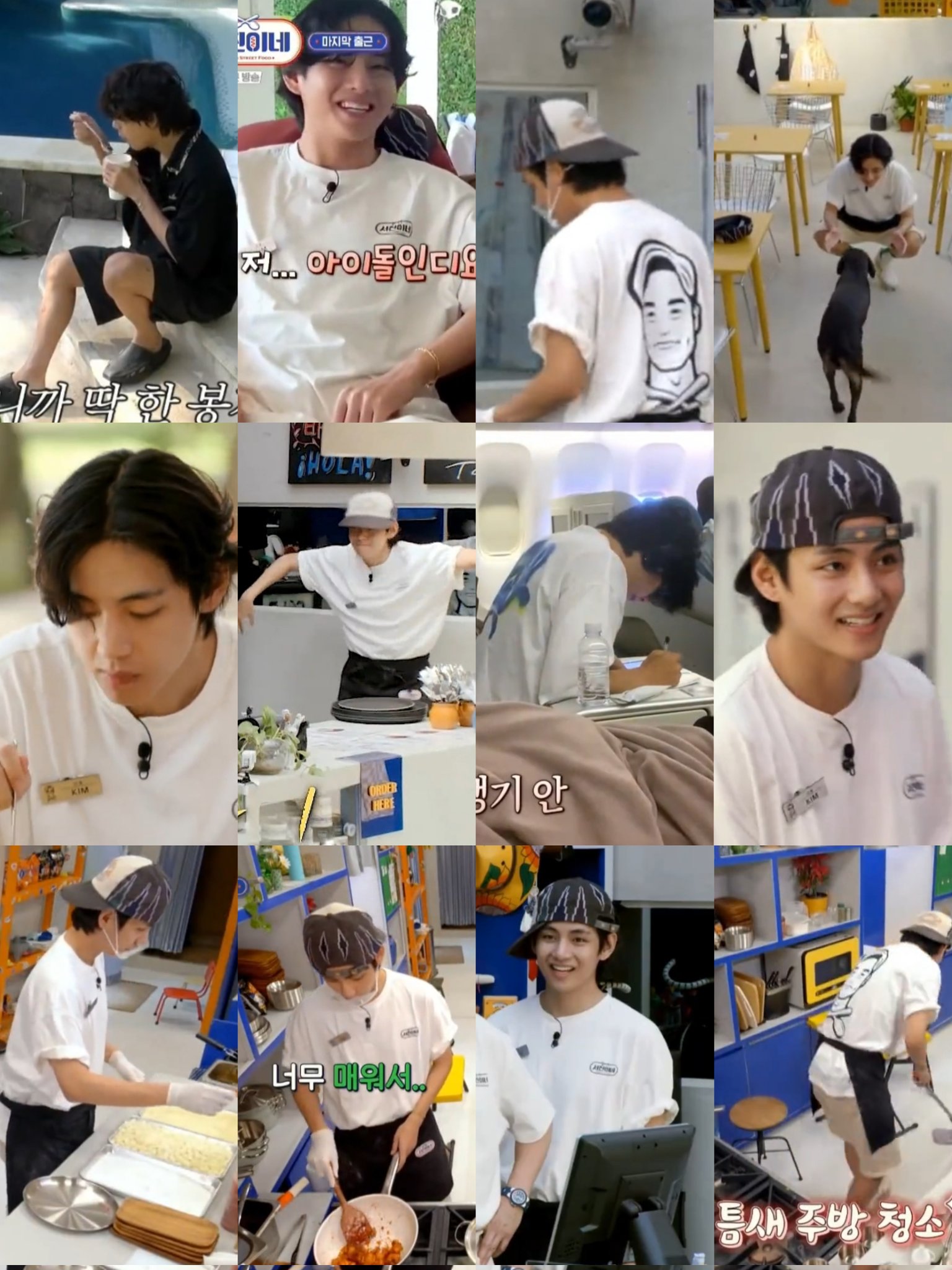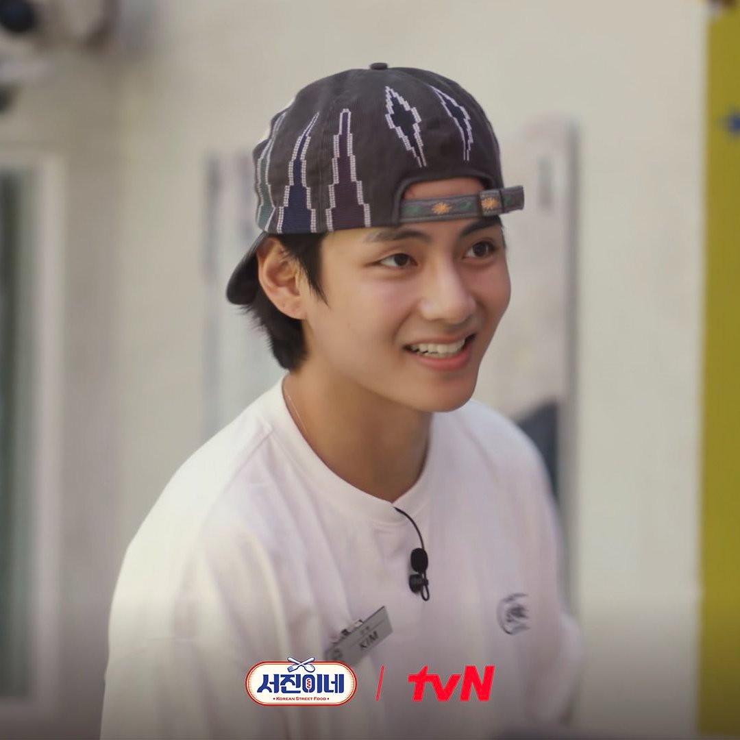 As a restaurant trainee, V worked hard in the kitchen, helping to prepare and even cook various dishes for the restaurant's customers. He's in charge of adding toppings to the popular ramen and completing the hot dogs, which are selling like hot dishes.