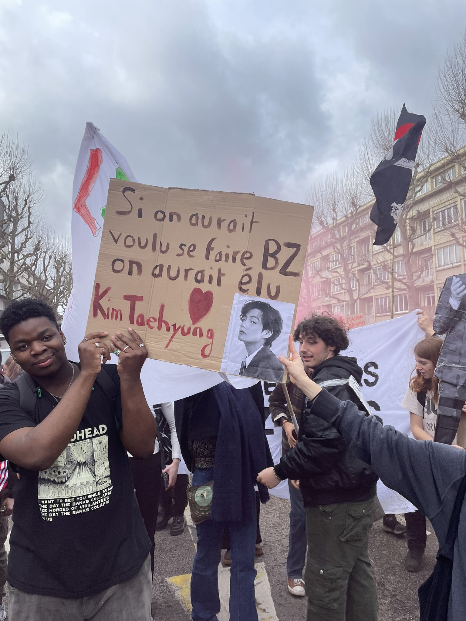 It would be normal if the slogan didn't include a mention of Taehyung, V's real name, as an option for the French presidency. The text on the banner is translated as "If we had wanted to be ḟüċḳed, we would have elected Kim Taehyung (as president)".