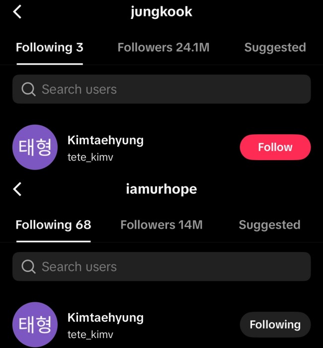 Another detail made the speculation even more convincing. Earlier that same morning, Jungkook had been noticed “cleaning up” his TikTok following list. He unfollowed more than 200 accounts belonging to dancers, TikTok creators, and other artists, reducing his following list from around 255 accounts to only two official ones: BTS and j-hope. Therefore, if @tete_kimv were not V’s account, there would be no reasonable explanation for why it appears on Jungkook’s following list afterward.