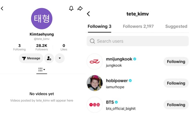Meanwhile, the account believed to belong to V is currently following three accounts: the official BTS account and the two members j-hope and Jungkook.