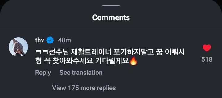 "Seonsunim (representative player), please don't give up on becoming a rehabilitation trainer. Please achieve your dream and definitely come find (me) hyung, I'll be waiting", V replied in the comment section of the Instagram post.