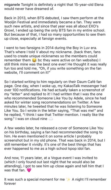 Her post struck a chord with fans as she revealed she was one of BTS’s earliest supporters back in 2013 — when, as she said, “that year was all about OO,” and no one at her school liked the group. She also shared photos from two BTS fansigns she attended during the Boy in Luv era in 2014, adding authenticity to her story.
