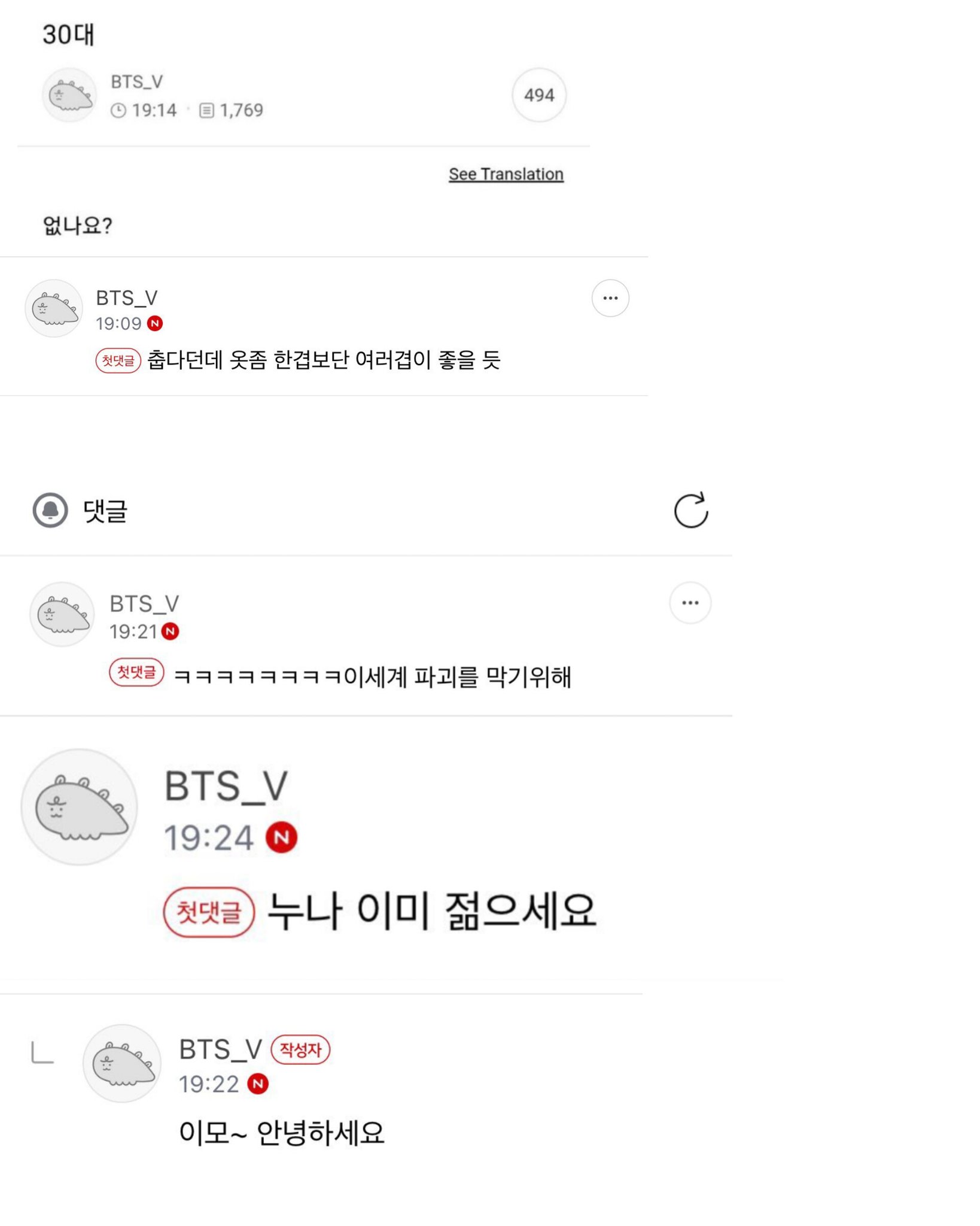 He then also had a conversation with other fans. When he asked: "30s? Isn’t there?People say it’s cold, so it might be better to wear several layers rather than just one", the other fan commented below: "If you were looking for someone in their 30s… I’ve arrived". He's so excited, replied: "I’m here to prevent this world from collapsing". Many "old" ARMYs came then and left comments like: "An ARMY who became a fan in my thirties and is now in my forties", "What does time even mean? I may have gotten older, but my heart has grown richer with these ten years. Thanks to BTS, I’ve lived happily and feeling young, and I’ll keep living that way from now on too", "Taehyung-nim~ there are ARMY aunties in their 50s too",...