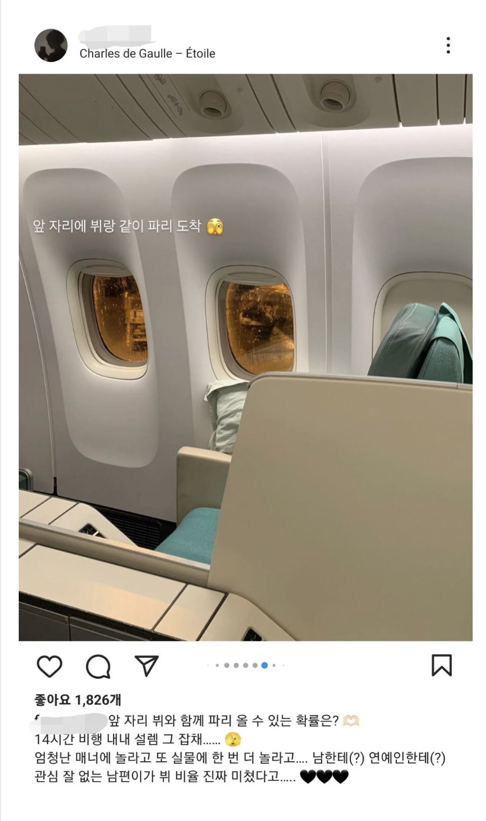 OP wrote in her post: "What are the chances of being able to reach Paris with V in the seat in front of you? My heart was fluttering throughout the 14 hours flight… I was so surprised at his amazingly [good] manners and once more at his real life visuals… Even my husband, who rarely takes interest celebs or in others said that V’s proportions were really insane…"