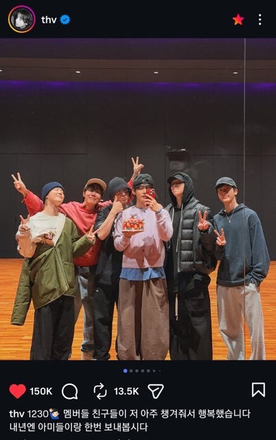 On the afternoon of the 30th, V shared several photos and videos on his personal SNS, accompanied by a warm message: “The members, friends, and people around me took such good care of me, so I was very happy. Next year, let’s spend it together with ARMY.” In the released photos, V can be seen wearing a bright smile while holding a birthday cake and a bouquet of flowers.