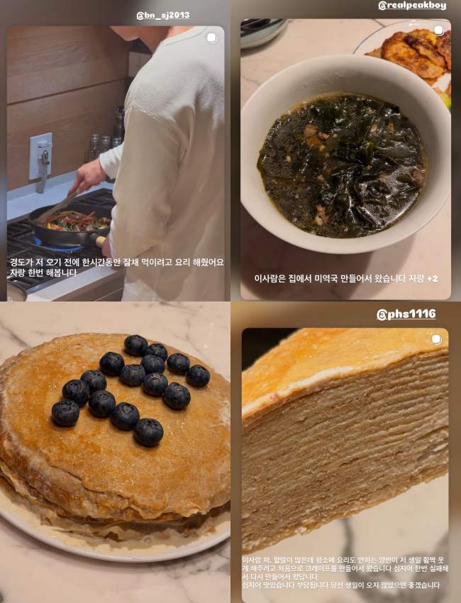 What caught even more attention was V’s later Instagram Story posts, in which he revealed that the people who prepared these meaningful dishes were none other than the members of the Wooga Squad. Each person took charge of a different dish, and even actor Park Hyung-sik, who is known for rarely cooking, prepared a dish especially for V.