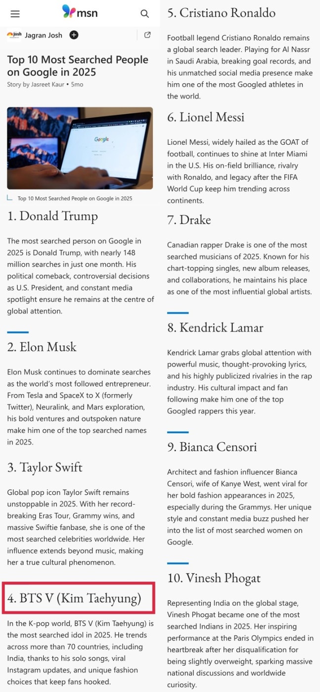Jagran Josh analyzed that V secured the 4th spot as the most searched person because "he remains at the center of attention in over 70 countries, thanks to his solo tracks, his explosively popular Instagram, and his unique fashion sense that captivates fans." This is particularly notable considering that his solo songs were released years ago and that V had been absent for half a year due to military service, only returning in the last six months of the year — without having carried out any official music activities yet.