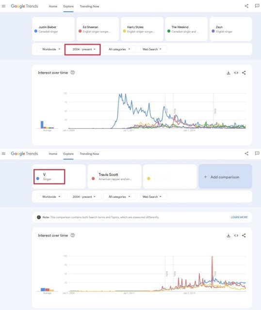In addition to the above ranking, V also placed sixth in the “Top 7 Most Searched Male Artists Born After 1990,” becoming the only K-pop star included in the list. Justin Bieber (who debuted in 2009) topped the list of male artists born in the 1990s. The following positions went to Ed Sheeran, Harry Styles, The Weeknd, Zayn Malik (former One Direction member), V, and αмєяι¢αn rapper Travis Scott in seventh place.
