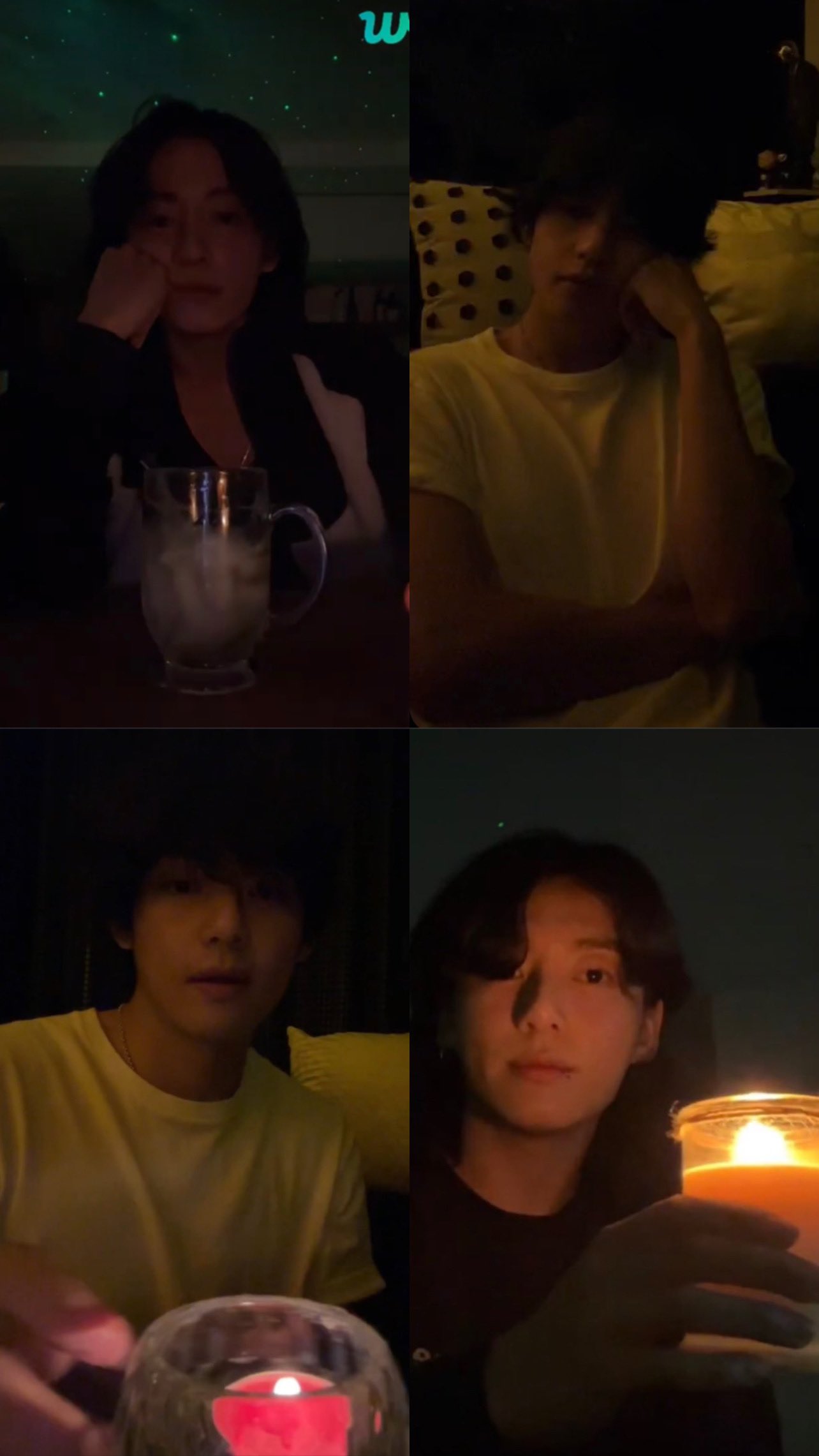 V quickly found a few candles to light while discussing about the candle. He said: "It’s dark? How’s this. I’m gonna bring a candle like Jungkook. Wait!", and then he continued: "It's not a candle...I didn’t want to smell the candle scent".