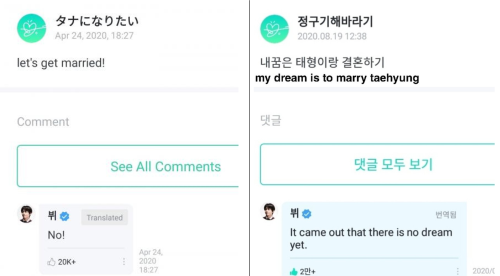 Meanwhile, Taehyung has a frank and deviant way of communicating by sharing his true thoughts. He also openly said "No" to his fans when they mentioned a love relationship and only stopped as a close friend.
