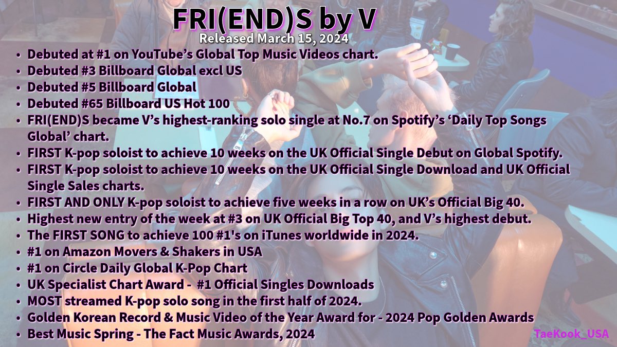 For those unaware, V's track Fri(end)s debuted at No. 1 on YouTube's Global Top Music Videos chart, No. 3 on Billboard Global Excl. U.S., and No. 5 on Billboard Global. It also became the first K-pop solo song of 2024 to reach 100 No. 1s on iTunes worldwide. Moreover, the track spent ten consecutive weeks on the UK Official Singles Download and Sales Charts, making V the first K-pop soloist to achieve this milestone.