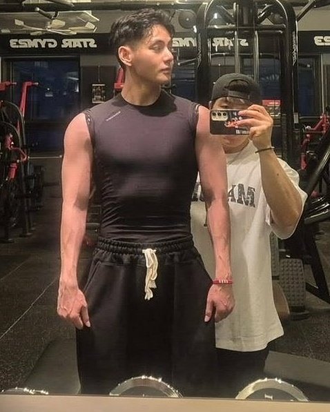 Trainer Choi captioned: "I can't believe the two young men my wife watches in videos every day are right in front of me, haha. Calm yet strong energy, and you can feel the sincerity in every aspect of his attitude towards exercise!! On top of that, he has great strength too!!..."