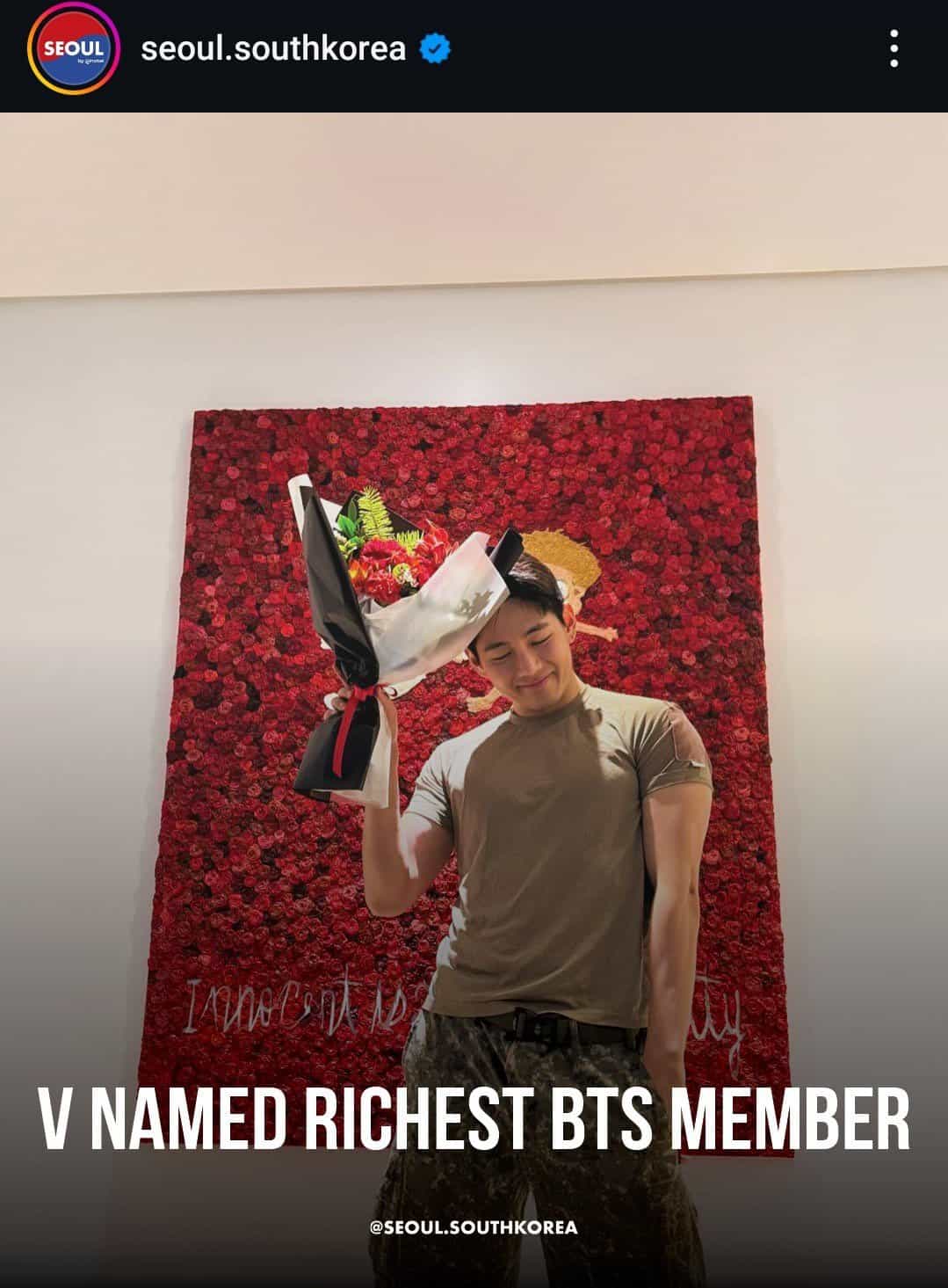 On June 26, 2025, a popular кσяєαn Instagram update page @seoul.southkorea gave the correct answer to this question of the majority. V was concluded to be the richest among the seven members!