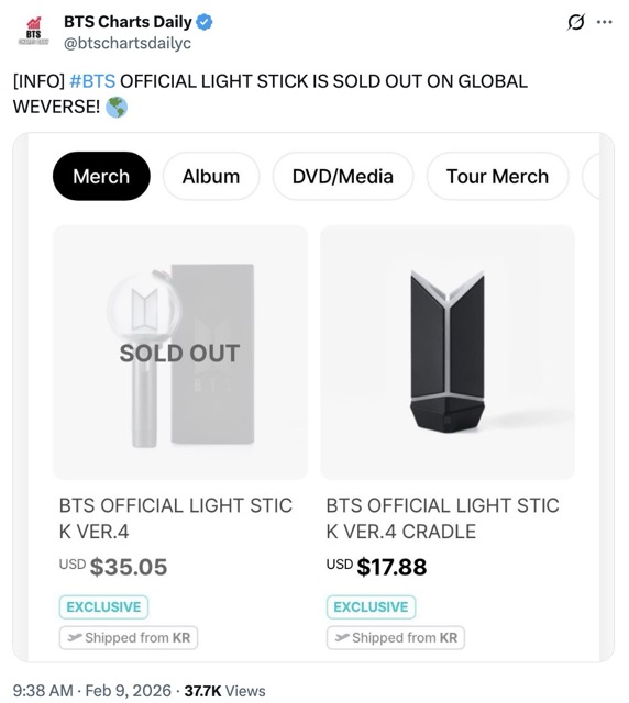 As expected, BigHit Music quickly announced the latest version of the official lightstick, ARMY Bomb Ver. 4, designed to match the new era of the upcoming world tour. On February 6, BigHit announced that ARMY Bomb Ver. 4 would go on sale via Weverse Shop at 11:00 a.m. KST on Monday, February 9, 2026, sparking mαѕѕive excitement among fans.